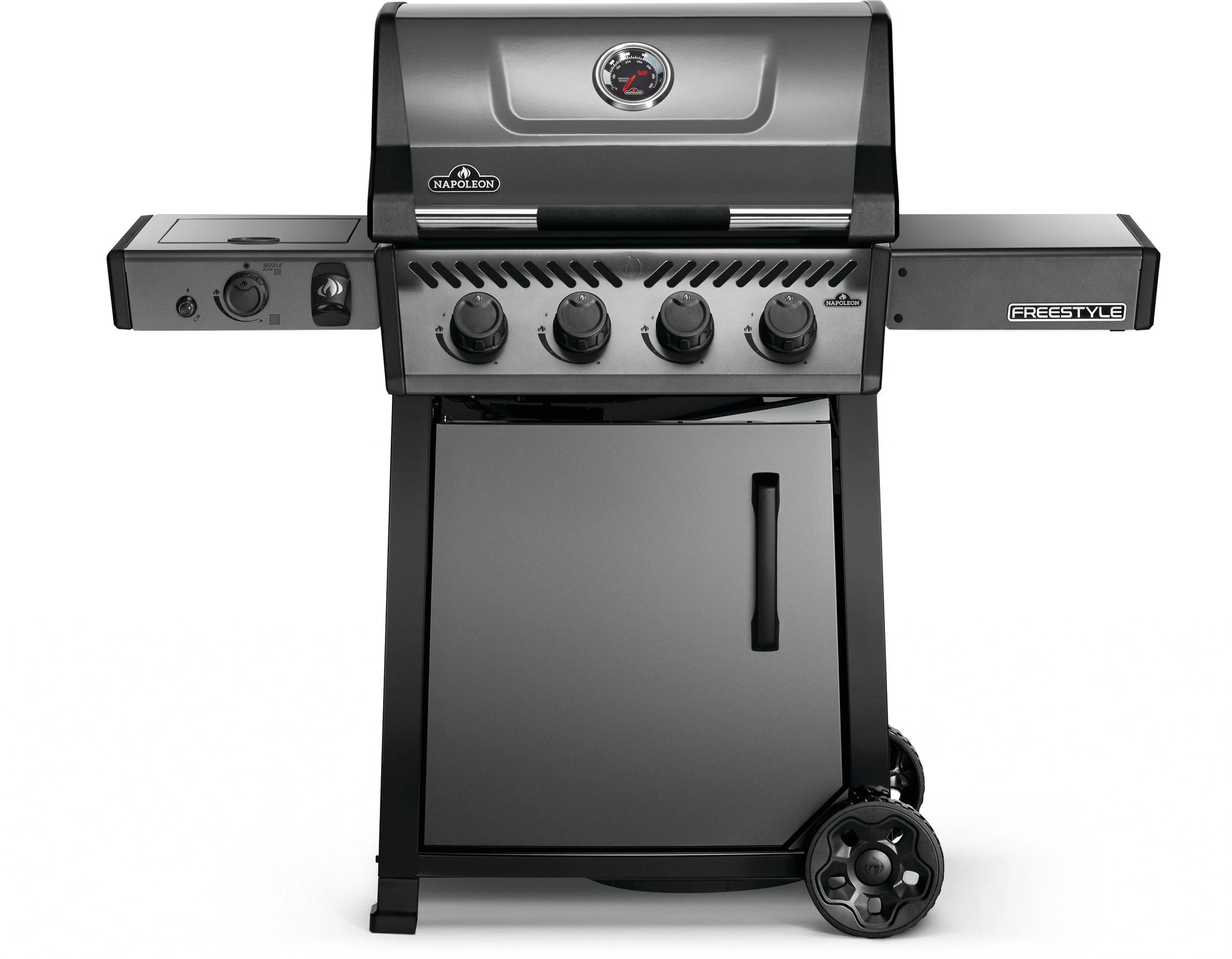 The Freestyle™ 425 Propane Gas Barbecue with Infrared SIZZLE ZONE™ Side Burner is a compact grill with premium features and unbeatable value. The best: the Napoleon accessory package leaves nothing to be desired! Beside a BBQ sauce and a BBQ apron, you will get a windshield for the SIZZLE ZONE™, a bamboo cutting board, a smoker box, smoker chips and a griddle! Ignited by the instant JETFIRE ignition system that lights the main burners with a jet of flame easily, every time. Get the perfect sear over the cast iron porcelainized enamel cooking grids. Four stainless steel burners provide even heat, easily controlled and monitored by the onboard temperature gauge. Get the perfect restaurant sear or prepare side dishes while you grill with the infrared sear station side burner. The rugged wheels allow this barbecue to go where the action is, while the easy-to-fold right side shelve, featuring tool hangers and a bottle opener, make sure that the Freestyle™ meets your lifestyle and space.