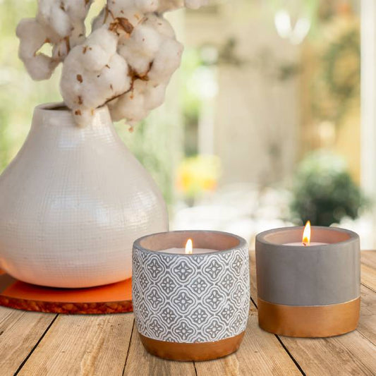 CONCRETE POT WITH ROSE GOLD BASE CITRONELLA CANDLE WITH WIND RESISTANT WICK